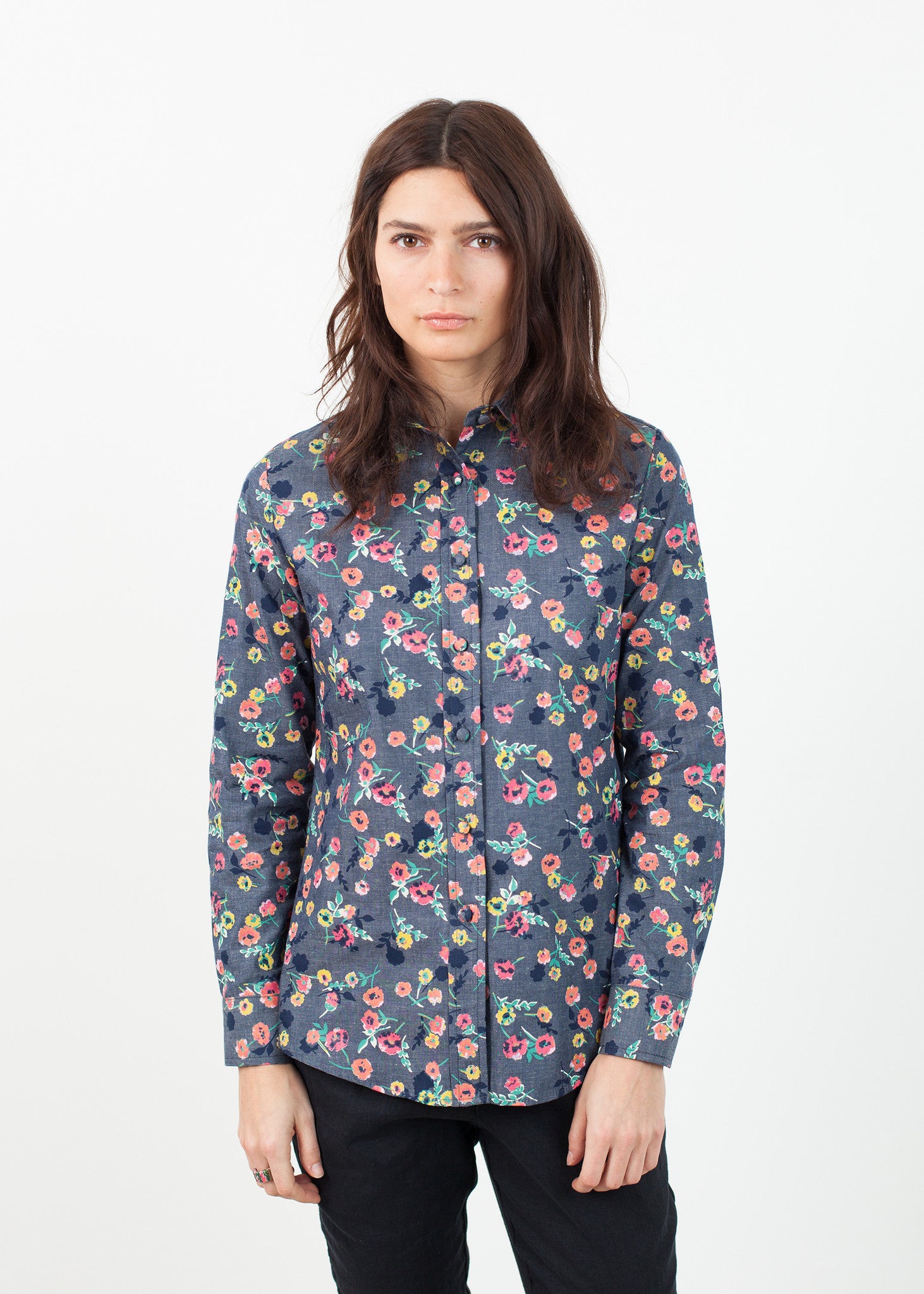 Floral all over, this blouse ignites springtime joys. Tailored to slim fit. Feminine, soft Peter Pan collar. Single button front placket. Tapered cuffs. Back yoke. Harvey Faircloth. Color Black/Floral. 100% Cotton. Made in U.S.A. Lana is wearing a size 2.