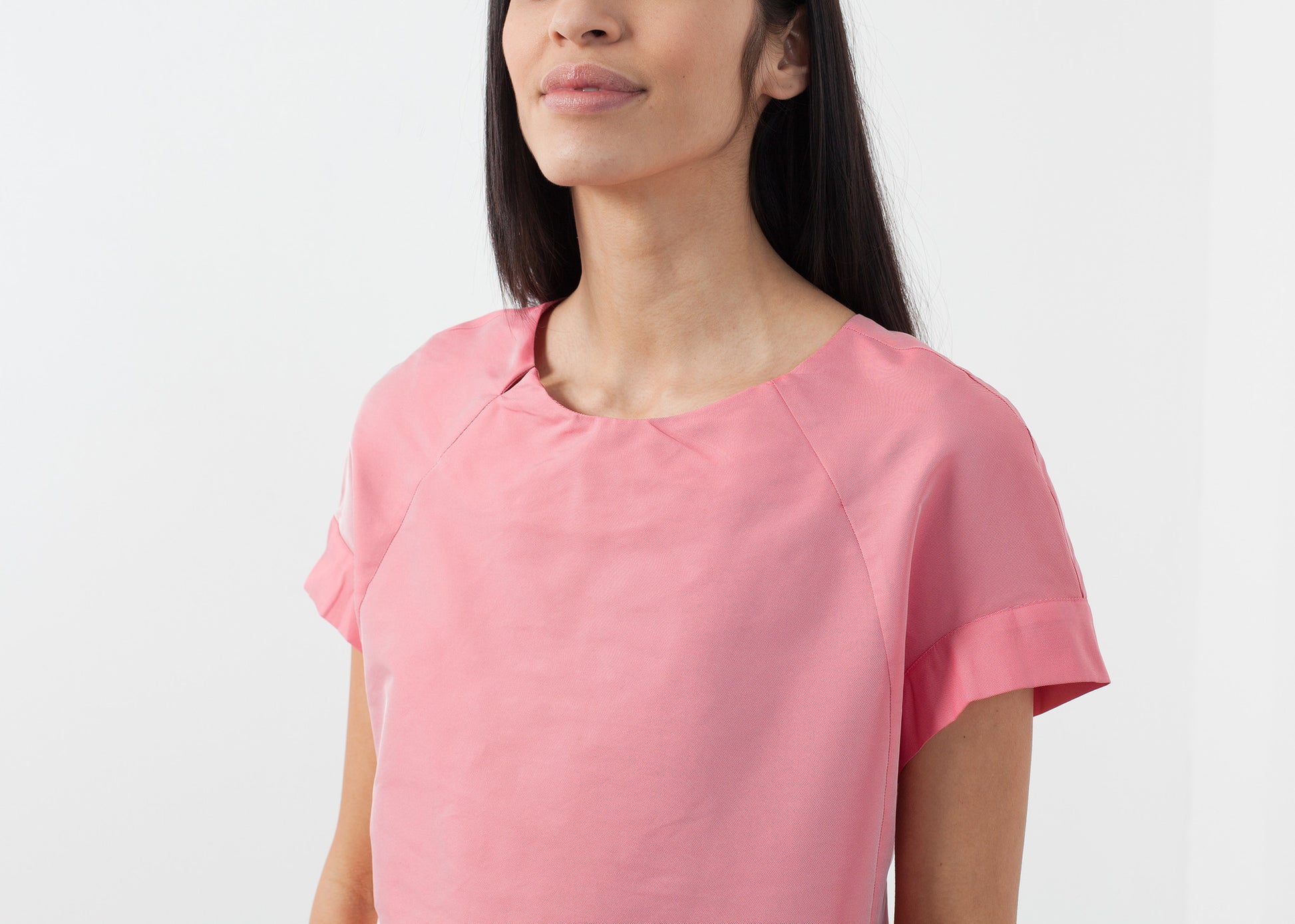 The Retenue Dress offers a wide neckline and a slightly oversized silhouette. Raglan seaming. Drawstring at back waist. Side angled pockets at front. Lilith. Color Pink. 100% Polyester. Ashley is wearing an X-Small.