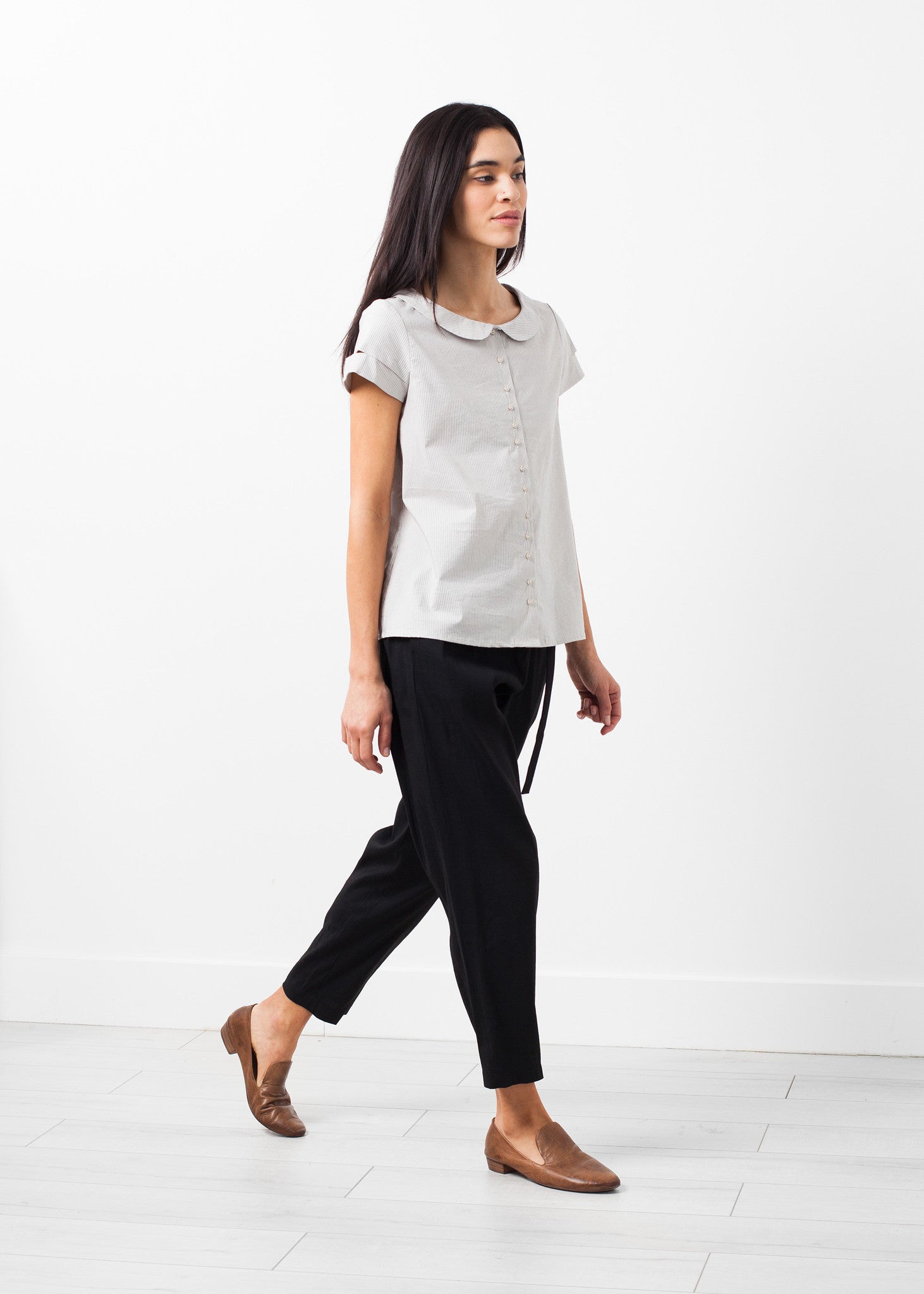 The Rudolf is a pretty top for any apparel needs. Button placket closure at front. Capped sleeves. Wide Peter Pan collar. Lilith. Color Fog. 67% Cotton, 33% Anidex. Ashley is wearing an X-Small.